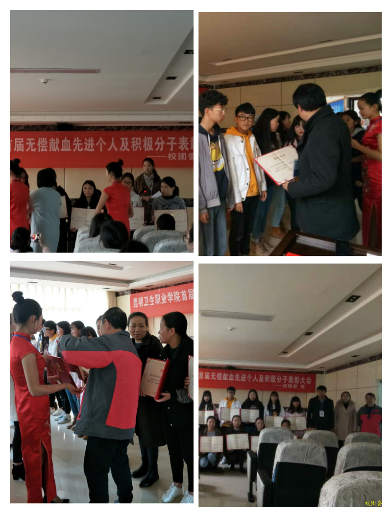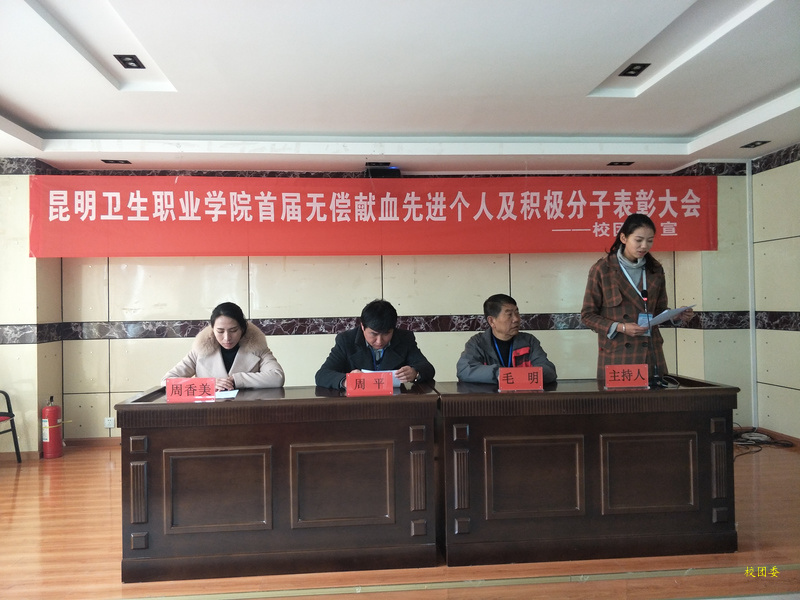为深入贯彻落实党的十九大精神和进一步倡导“奉献、友爱、互助、进步”的志愿者精神,beat365团委与云南昆明血液中心联联合开展多次无偿献血系列活动,并且在活动中,踊跃出了许多先进个人和积极志愿者,于2017年12月27日开展了表彰大会对无偿献血活动中的先进个人,积极分子进行表彰。到场的嘉宾有学院副院长周平同志,学院党政办主任毛明同志,和学院团委老师艾长辉老师、高梦婷老师、董敏老师,昆明血液中心周香美老师及学生代表。