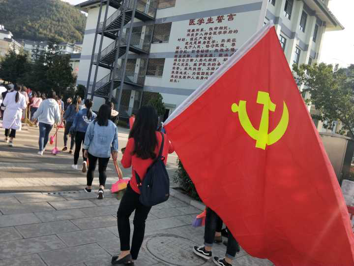 此次活动共分为两个大组进行。第一大组由学生党支部组织委员王冬同志带领部分教师党员同志和学生入党积极分子分别对教师公寓楼道、学生宿舍及周围环境进行清扫。第二大组是有教师党员组成的队伍,由学生党支部书记雷红梅同志和宣传委员朱蓉同志带队,负责校园主干道、食堂周围垃圾的捡拾。待任务分解后,各位同志们手持打扫工具,有组织、有纪律的分别向指定地点走去,到指定地点后,同志们很快行动起来,纷纷拿着扫把积极地往各栋楼走去,把指定片区的纸屑灰尘等认真地打扫干净。