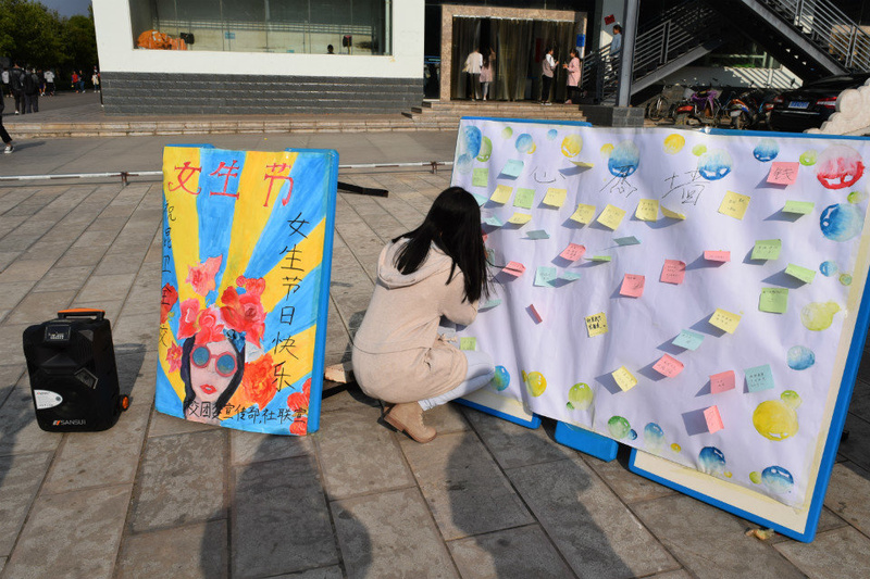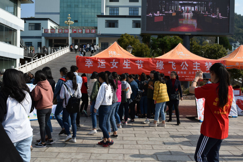 穿戴白色、粉色和红色衣服的女同学作为本次活动的幸运女神,可以参加幸运大转盘活动而获得节日的祝福,没有得到幸运礼物的女生可以在心愿墙上写下自己的心愿。