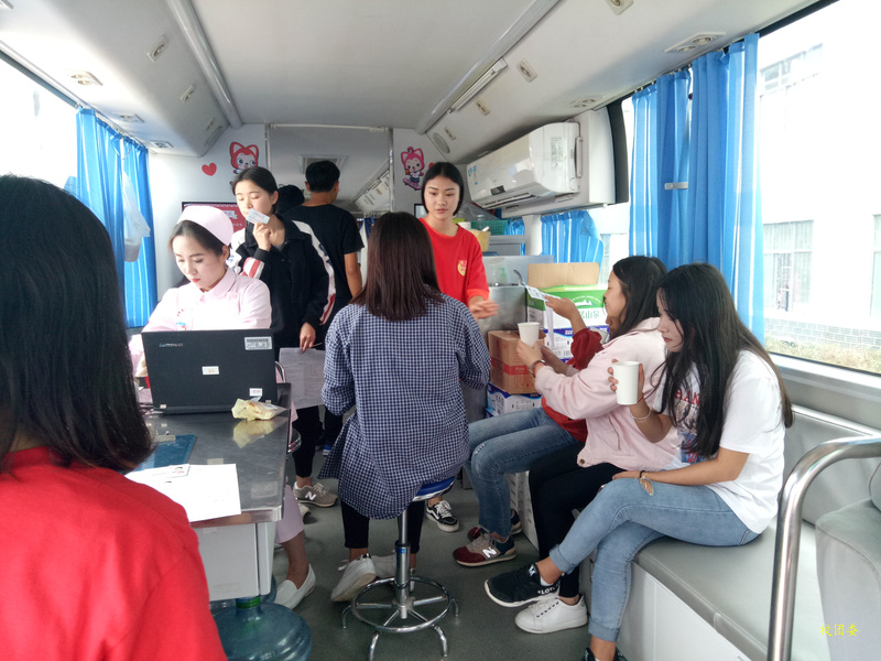 献血过程中志愿者们积极协助工作人员完成任务,耐心讲解采血过程中需要注意的细节缓解紧张心情、给献血者递水做好献血前的准备、并热情的给献完血的同学打印证书,发放小礼品。忙碌的背影在拥挤的献血车上形成了一道靓丽的风景。