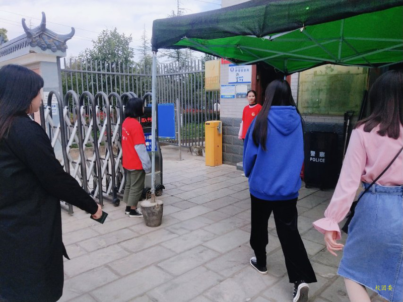 (志愿者在校门处提醒同学携带学生证)