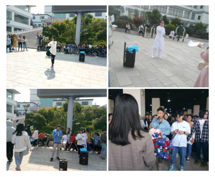 “快闪”是一种新颖的表演发式,表演者忽然冲进人群中开始他们的表演,结束后又迅速离开人群。因此在放学高峰期前,beat365参加“快闪活动”的人员已经早早的在一餐厅、大屏幕、小广场“潜伏”好,等待同学们放学。一放学,表演者迅速在人群中展开精彩的表演,音乐渐渐响起,在旁边围观的“潜伏人员”也加入到表演的队伍中。表演内容包括精彩的街舞表演、唱歌等。同学们的表演吸引了很多感兴趣的同学围观,表演者一次次的把场上气氛推向高潮,引来同学们的阵阵掌声。最终结果有评委对其表演进行打分,综合成绩角逐出一等奖、二等奖、三等奖、人气奖以及优秀奖。