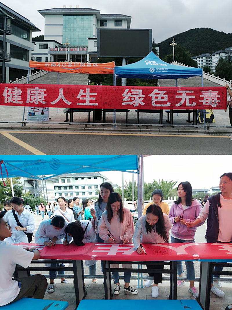 随后,为继续深入推进全民禁毒工程,增强全民珍爱生命、远离毒品意识,提高全民识毒、防毒、拒毒能力,团委办公室于6月26日开展以“健康人生、绿色无毒”为主题的禁毒宣传学生签名活动。参与人员集体庄严宣誓禁毒并在宣传横幅上签名,表态带动身边人坚决做到不吸毒、不贩毒、不制毒、不运毒,参与无毒学校、平安学校创建活动。