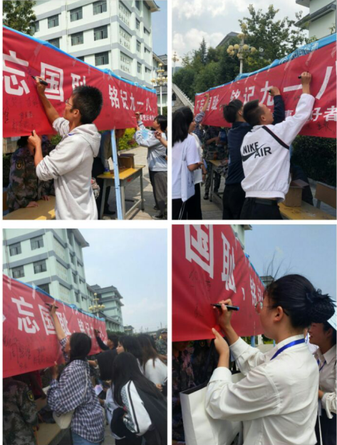 在活动中有一位正在本校参加技能大赛的老师说:“我们必须记住今天,今天是敌人打进我国的时候我们要让敌人不会在有那么一天。”并在布标签上了自己的名字。