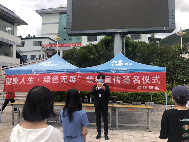 活动中,主持人介绍了毒品的危害及如何预防毒品相关知识,接着学生代表缪珊珊宣读了禁毒倡议书,随后学生代表在禁毒宣传横幅上签上自己的名字。