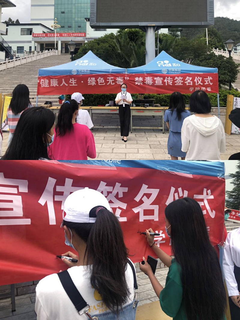 2020年是云南省开展第四轮禁毒人民战争的收官之年,正值新冠肺炎疫情期间这一个特殊的事情,学院团委结合学院疫情防控实际情况,于“6,26”国际禁毒日当天,组织学生代表在小广场前进行了“健康人生,绿色无毒”禁毒宣传签名活动。