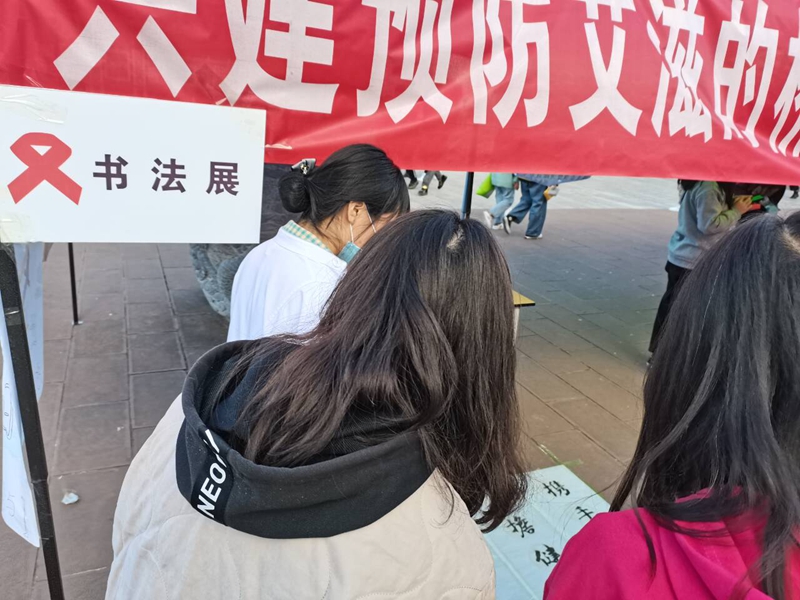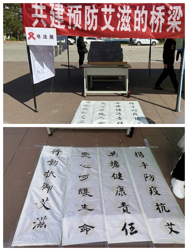 2020年12月1日由团委志愿者工作部和红十字会日在beat365平台官方网站白求恩雕像旁举行“携手防疫抗艾,共担健康责任”系列活动之三书法展,同学们来观看书法,既得到了艺术的熏陶,也增长了对艾滋病的了解,得到了一致好评。随着文墨轩同学写的“行动抵御艾滋,爱心呵护生命。共担健康责任,携手防御抗艾。”几行毛笔字的出现,同学们无一不被这刚劲有力的毛笔字吸引,仿佛无形之中告诉他们预防艾滋病的重要性。