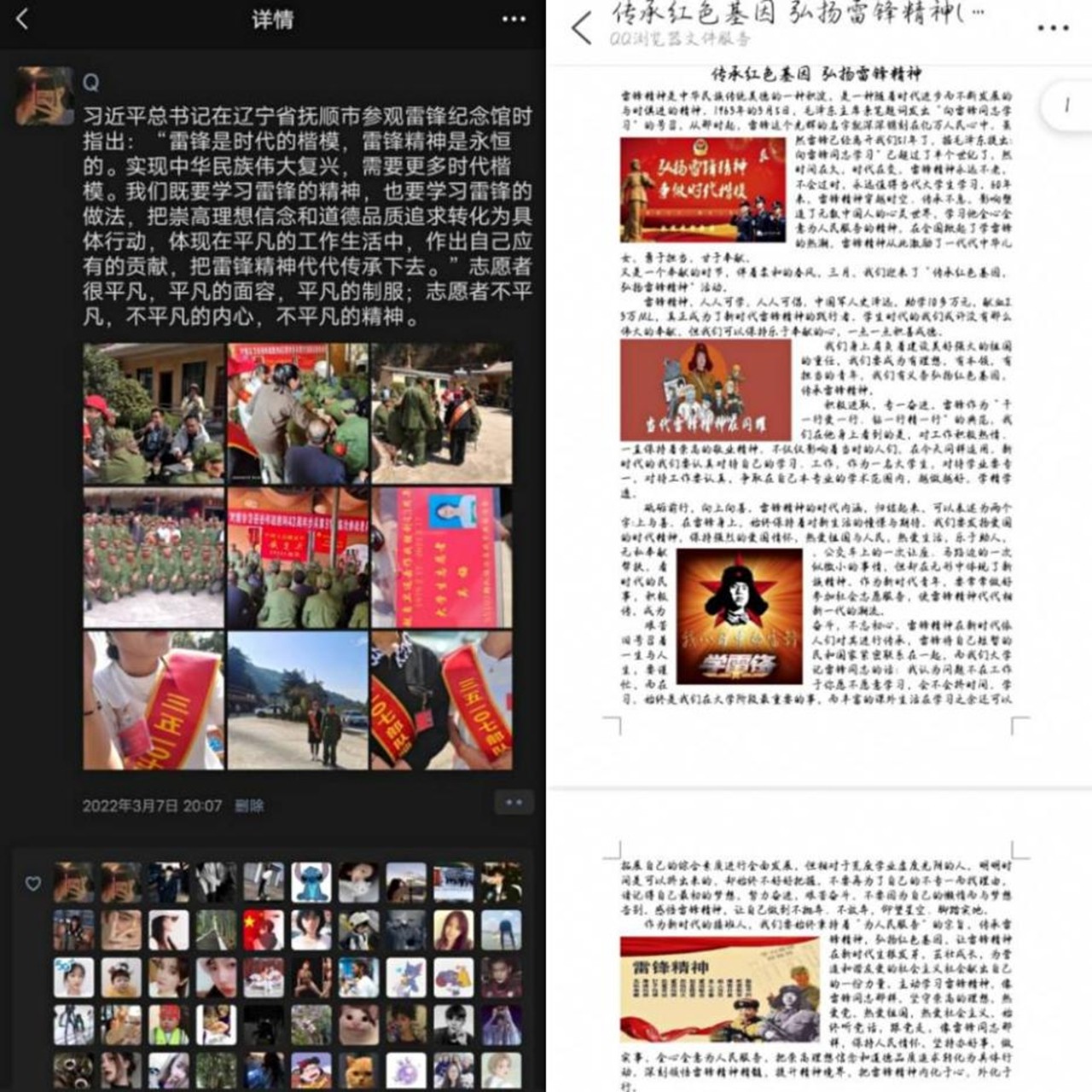 为了让广大师生传承红色基因,弘扬雷锋精神。学院团委宣传部举办的“传承红色基因,弘扬雷锋精神”主题活动于2022年3月7日—2022年3月9日在线上开展。本次活动在线上开展,参赛人员需要在2022年3月7日—2022年3月9日,通过微信、QQ、快手等社交平台发布关于“传承红色基因,弘扬雷锋精神” 相关文图进行参赛。在2022年3月7日12点—2022年3月7日15点内将参赛作品连并点赞量统一进行截图并且发至本次活动的相关群聊中。
