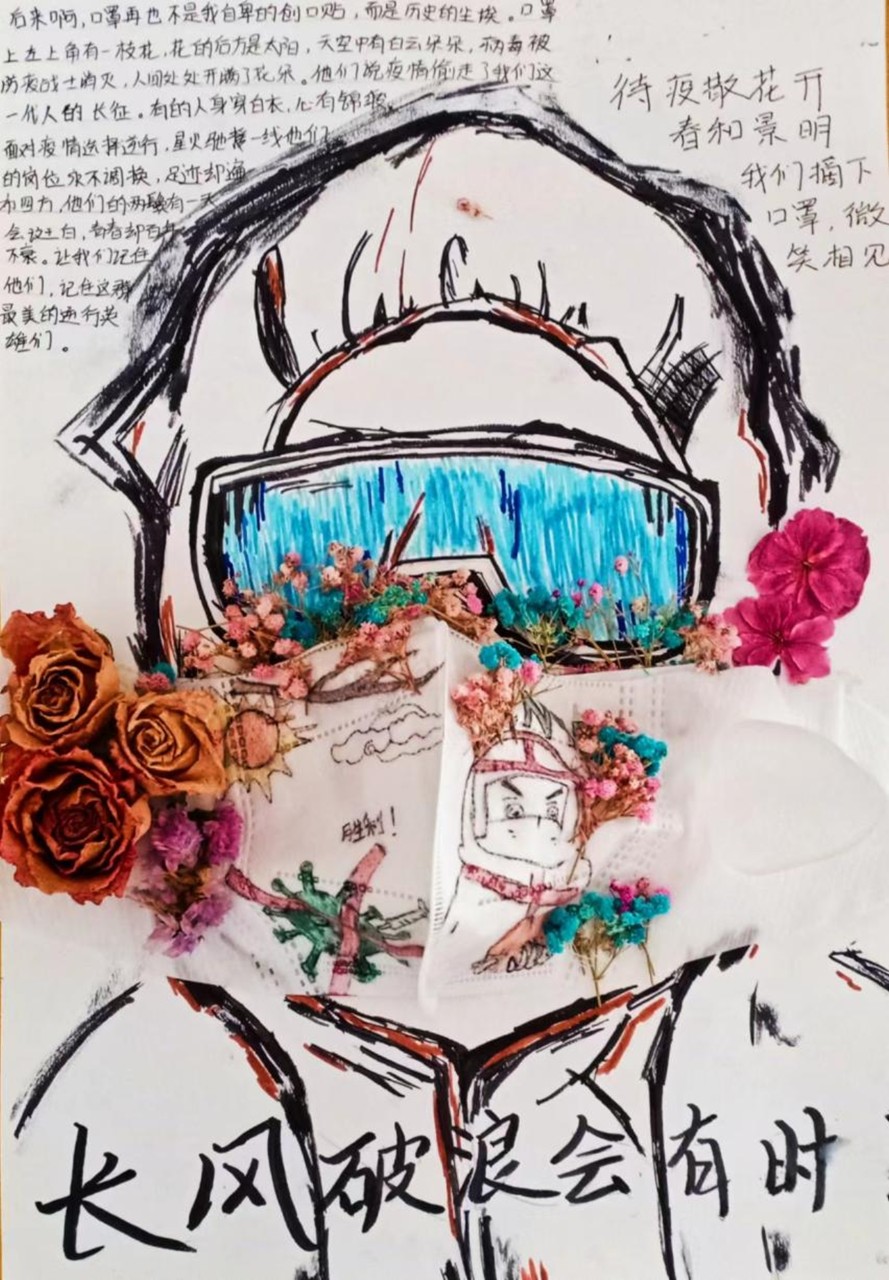 创意说明:在本作品正中间,在两名医护人员与疫情做斗争,保护着身后的人民,画于口罩上的是纪念他们的无私奉献,高飞的海鸥和周围的鲜花象征青少年在花一样的季节,应像花一样开的灿烂,且在成长的路上不畏困难,勇往直前,夏日天最烈代表我们战胜疫情的决心。