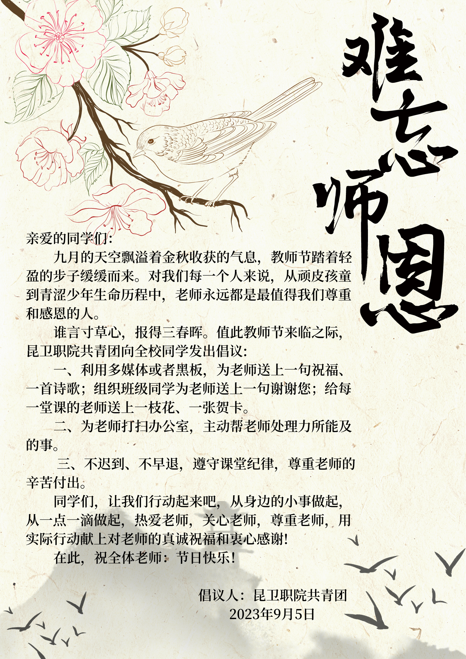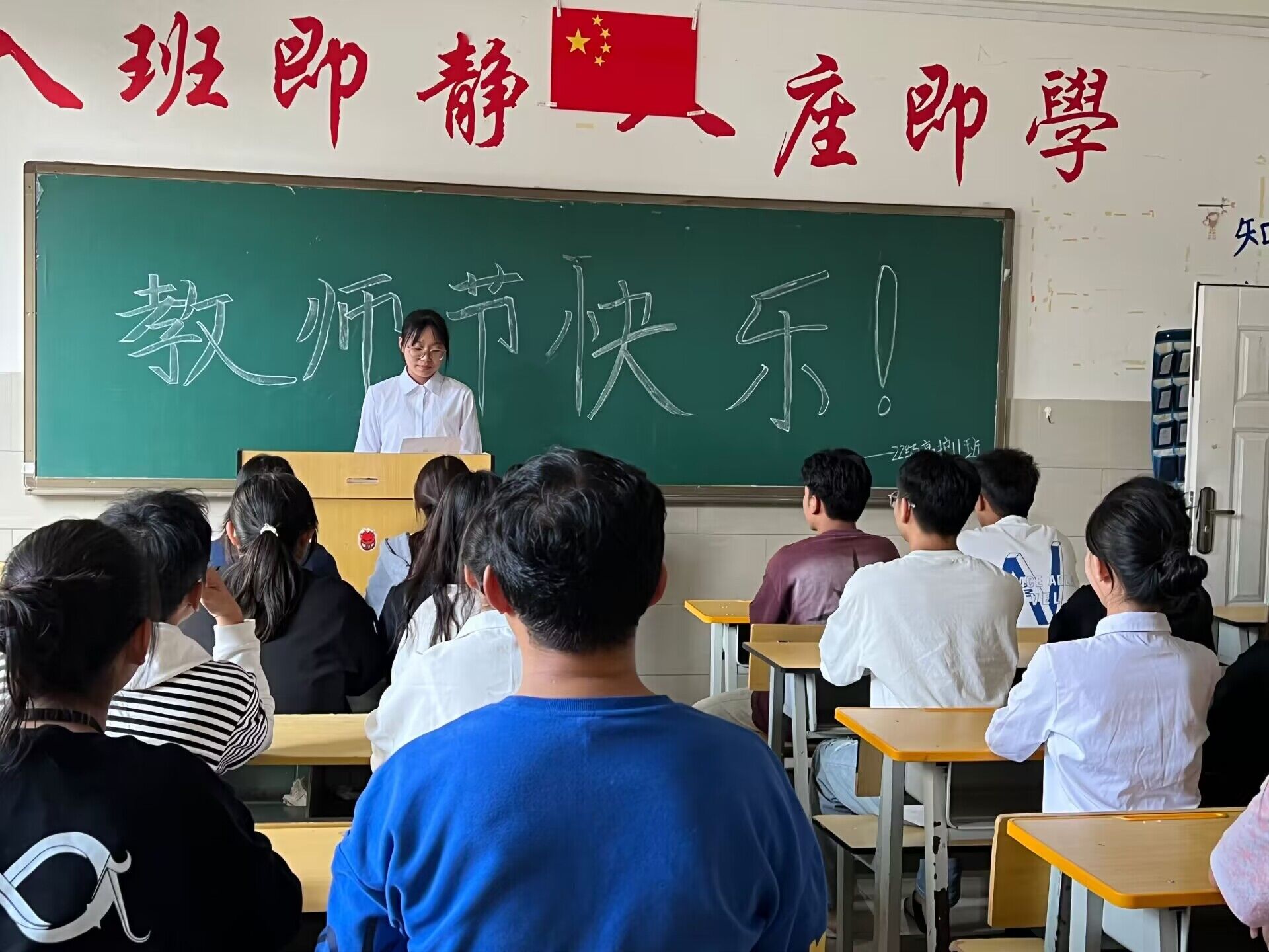 同时学院团委也面向全校发出倡议,让同学们以实际行动报答恩师,表达对老师们节日的祝贺。同学们以贺卡、献花、板书等形式为老师们送上祝福。