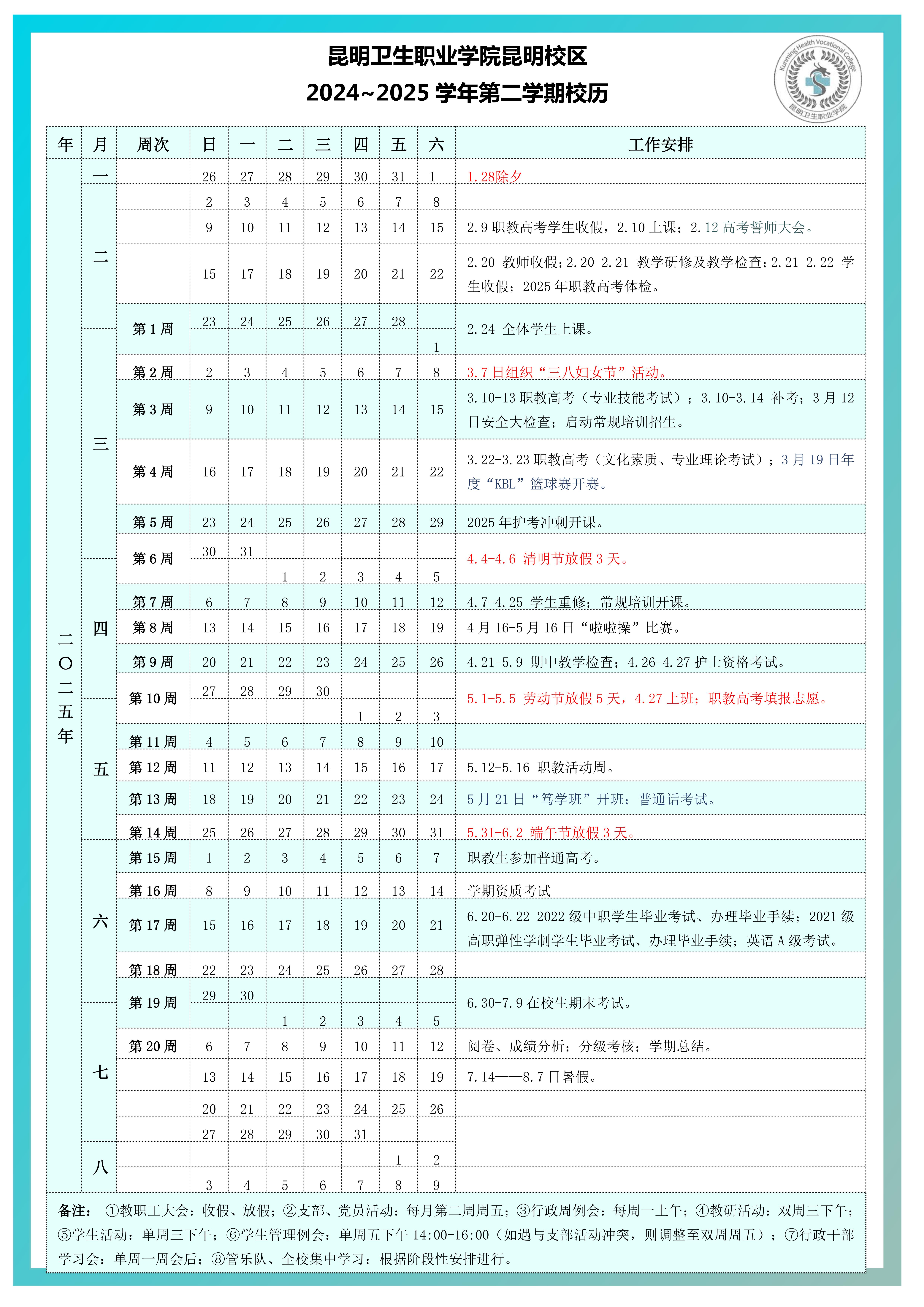 2024-2025年第二学期校历