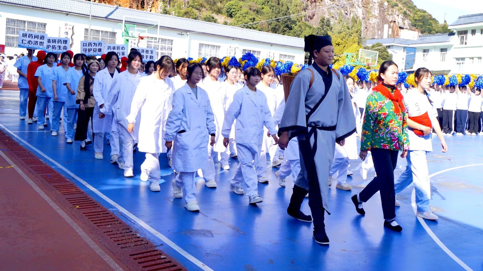 药学专业方队率先登场,铿锵步伐中携中西医智慧而来;护理专业方队紧随其后,专业底气十足;检验专业方队步履铿锵、目光坚定,尽显“临床诊断火眼金睛”的严谨;口腔专业方队如朝阳般活力四射,传递“口腔健康,全民健康”的核心理念;康复专业方队带着首次参赛便斩获省赛二等奖的荣光而来。