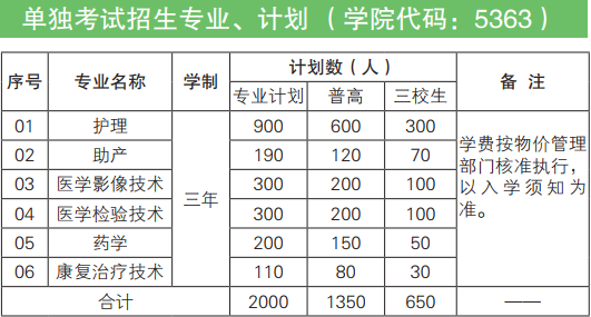 2020年单独考试招生专业、计划