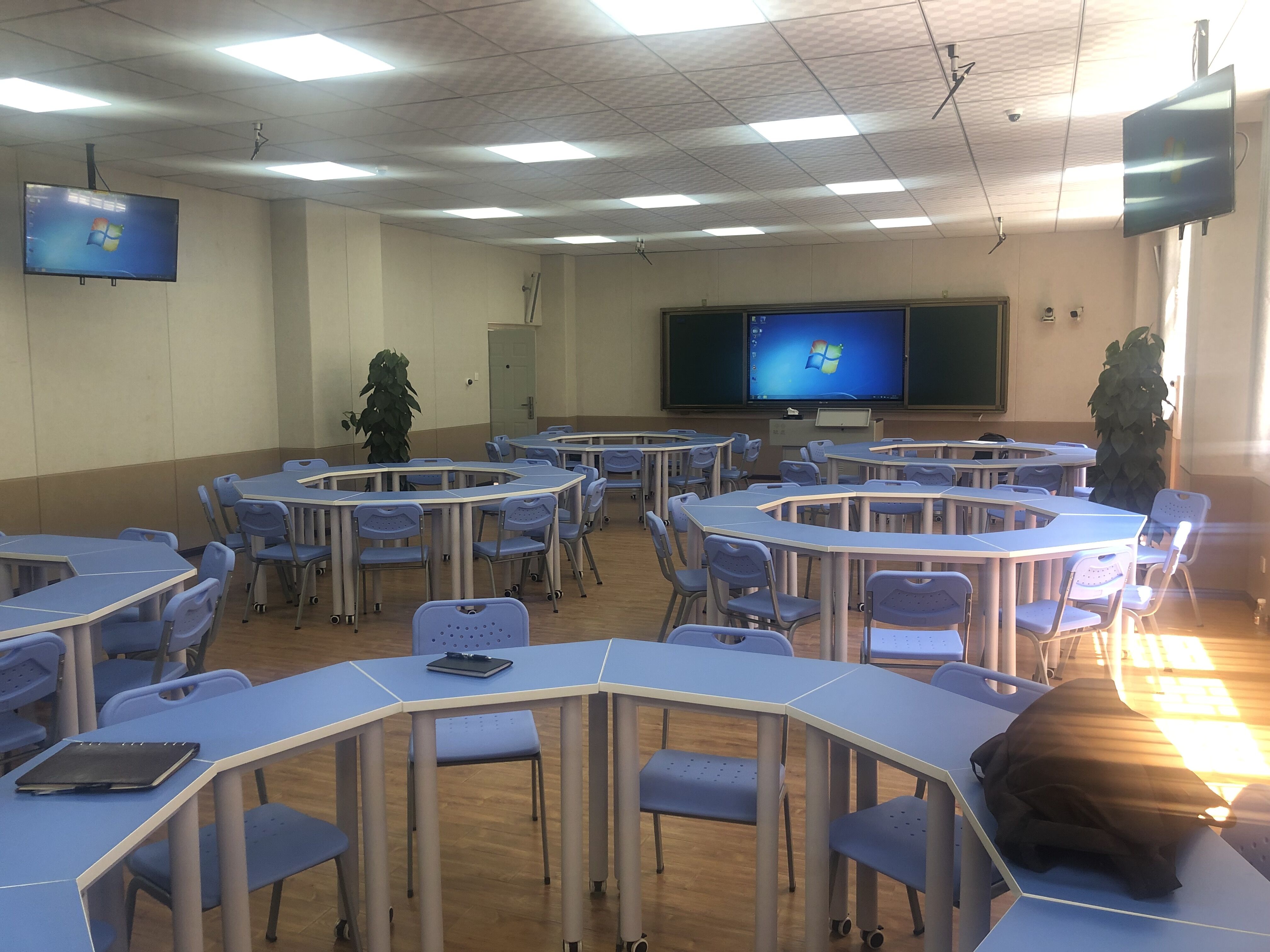 这是一间崭新明亮的智慧教室,蓝色的自由组合课桌,三块显示大屏。瞬间就能调动学生的积极性,活跃课堂气氛。