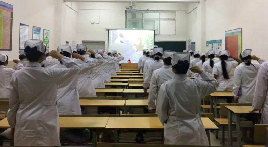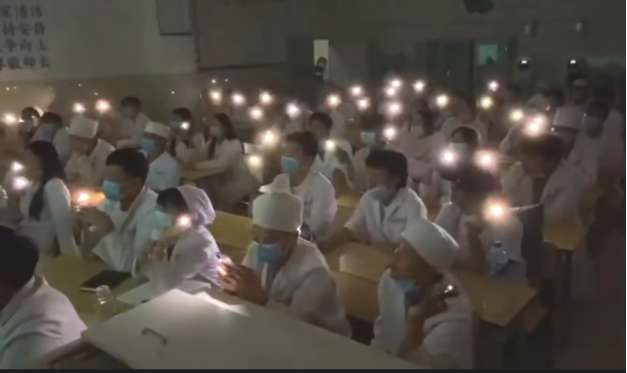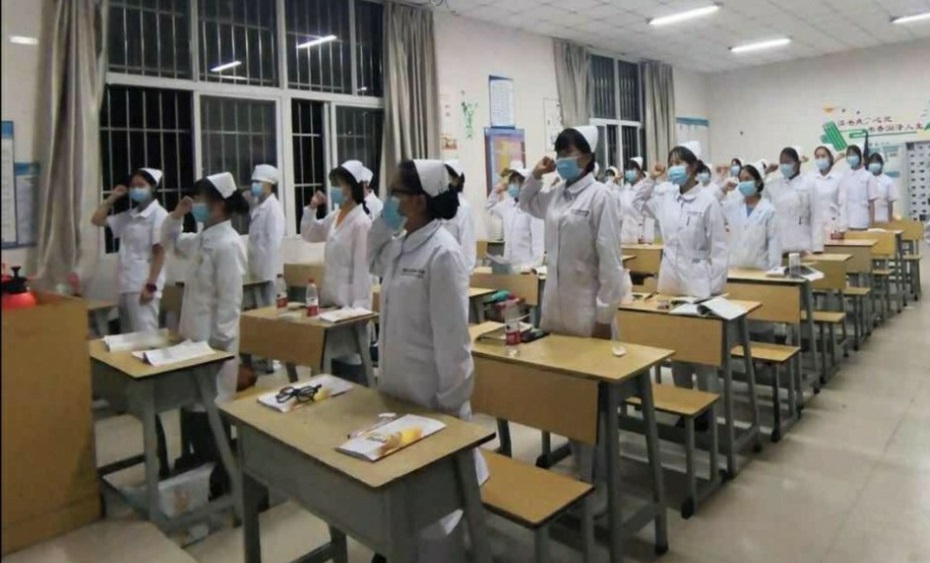 5月12日晚上七点半,学生在教室观看了直播视频,在云端和师生一起宣誓,对着南丁格尔,共同许下尊重生命、守护健康的铿锵诺言。一起合唱《中国护士之歌》,用歌声表达了对中国护士的感谢和敬意。