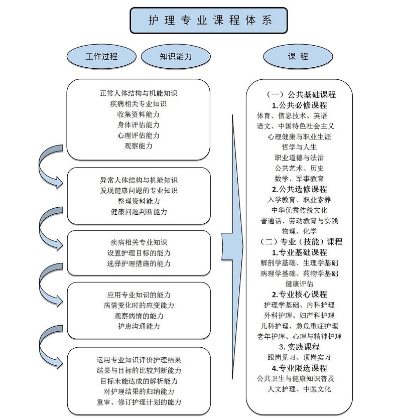 (2)专业核心课程:护理学基础、内科护理、外科护理、妇产科护理、儿科护理、急危重症护理、老年护理、心理与精神护理。