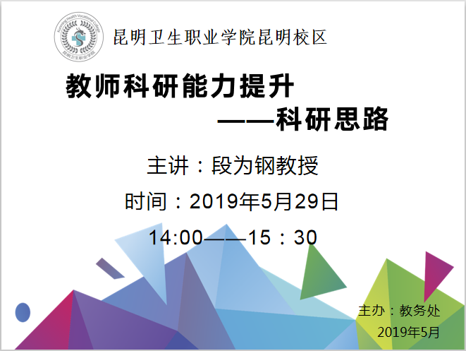 为进一步加强师资队伍培养,提升教师的科研能力,2019年5月29日,教务处组织了教师科研能力提升系列讲座,分别由云南中医药大学段为钢教授主讲《科研思路》和本校专利申报的领军人王廷英老师主讲《专利申请》。