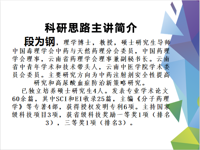 《科研思路》中段为钢教授用自己的亲身经历阐述了“发现问题、分析问题、解决问题”的科研思路。发现问题是科研的入口,我们应从日常生活中、教育教学中、临床实践中去发现问题,不好理解的,有悖于常识的现象往往就是发现问题的入口,不要轻易放过;较广的知识面有利于问题的分析,分析问题应分析导致问题的可能原因、主要因素、主要关系入手;解决问题基本上就是套公式!但要注意对公式变形,课参考相关的方法学书,相关的文献(CNKI数据库、PubMed数据库)。