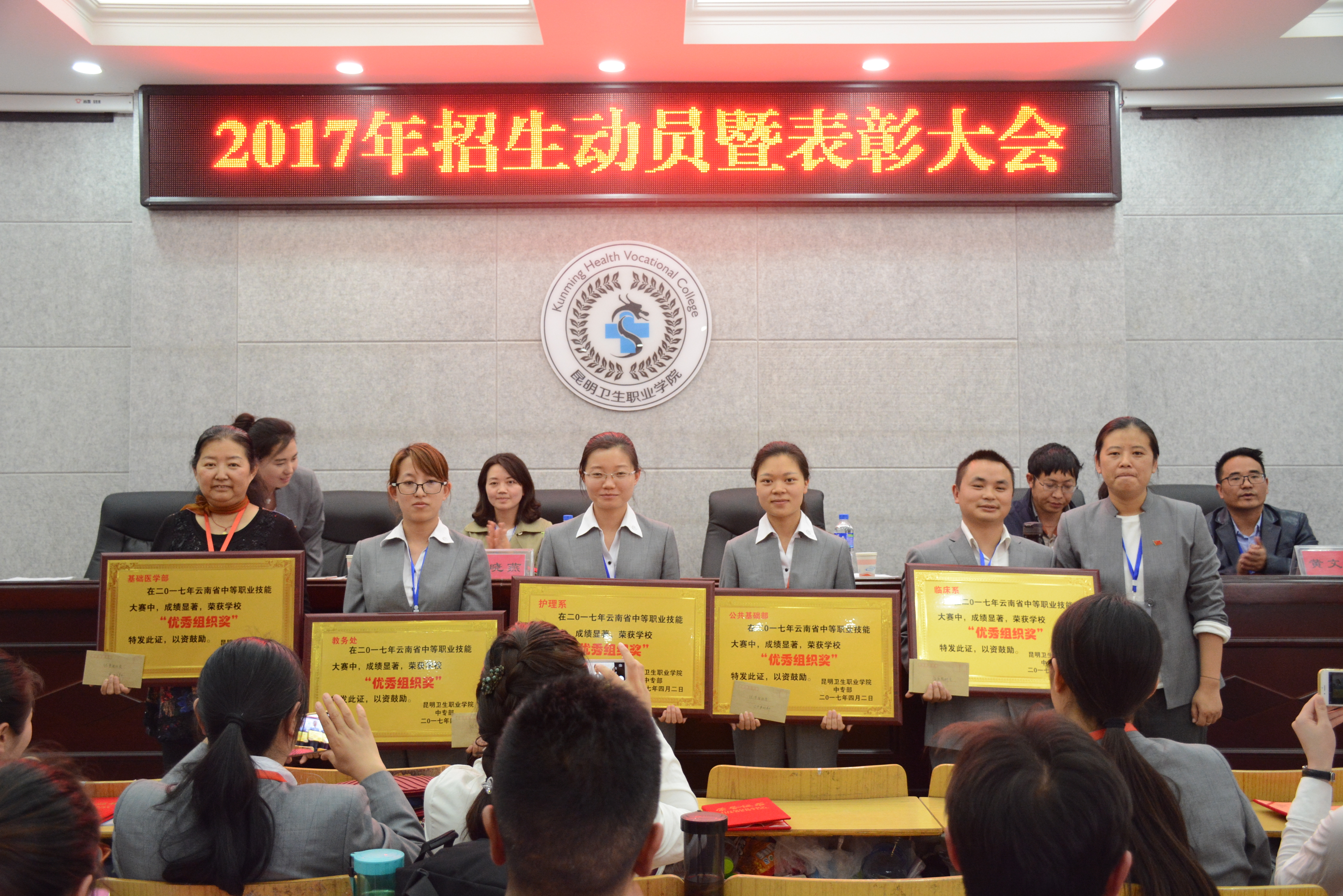 大会第二项议程,表彰2016年招生先进个人及团体,2016年招生工作在集团和学校强而有力的领导下,顶住招生政策和生源结构变化的双重压力,在全体职工的共同努力下圆满收官。在这项工作中涌现出一些先进个人及团体。由王副校长宣读了《关于表彰李冲同志等2016年度招生最佳个人(团体)的决定》,学校校领导及各部门负责人分别为受表彰的个人和及团体颁发了荣誉证书和奖金,并合影留念。同时,受表彰的同志分别在大会上作了经验交流。