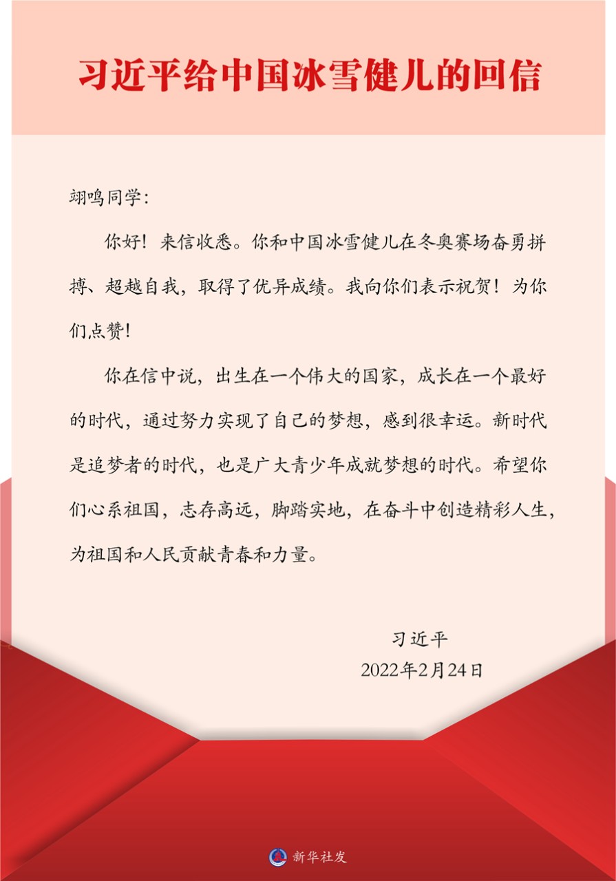 中共中央总书记、国家主席、中央军委主席习近平2月24日给中国单板滑雪运动员苏翊鸣回信,向他和中国冰雪健儿取得优异成绩表示祝贺,并提出殷切期望。