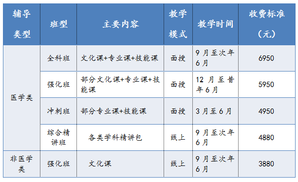 医学类主要覆盖“文化课+医学专业课+技能课”,非医学类主要为“文化课”。类型及对应费用标准见下表。