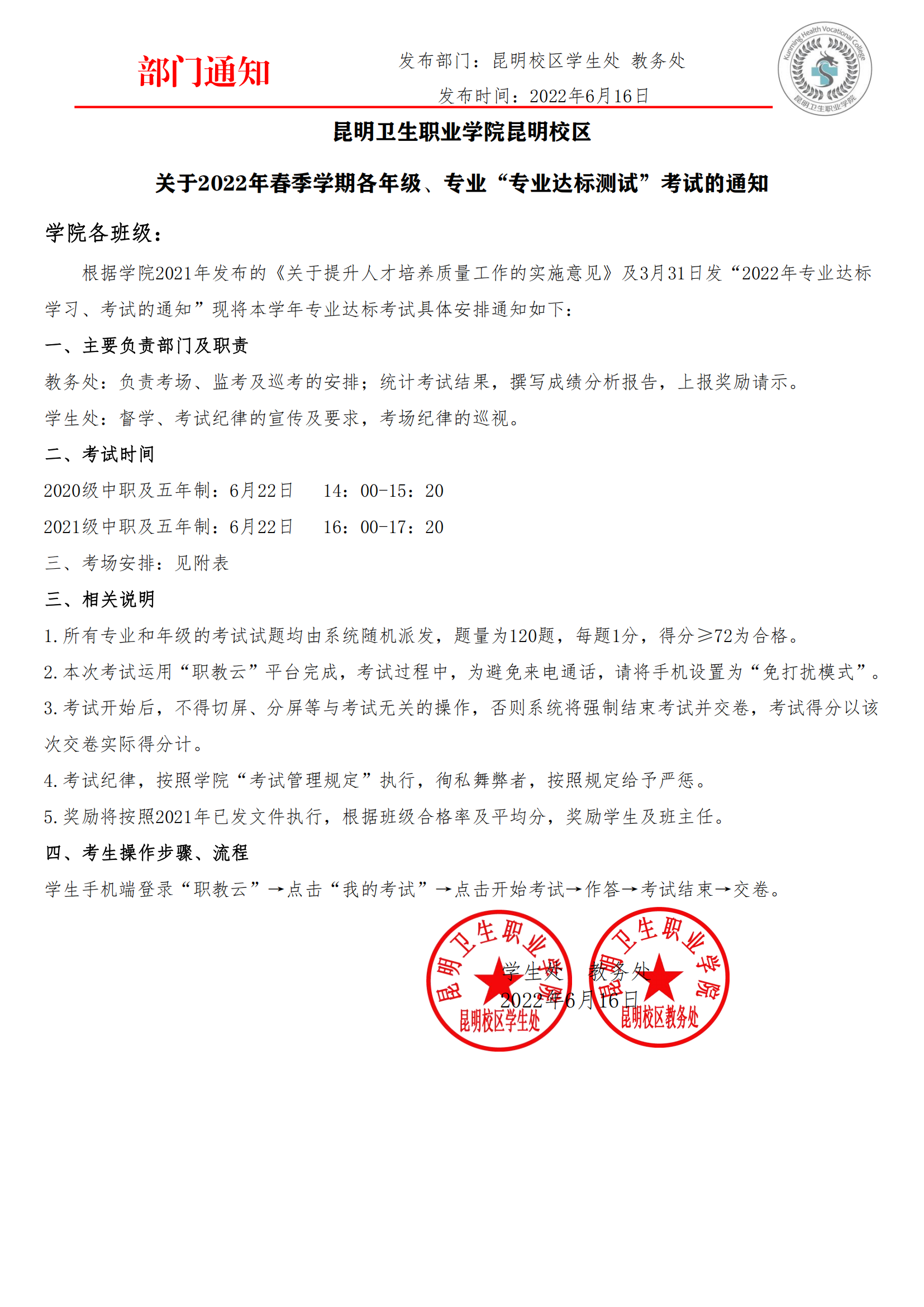 2022春季学期专业达标测试将于6月22日开始,请同学们合理安排时间,积极复习,按时参加考试!