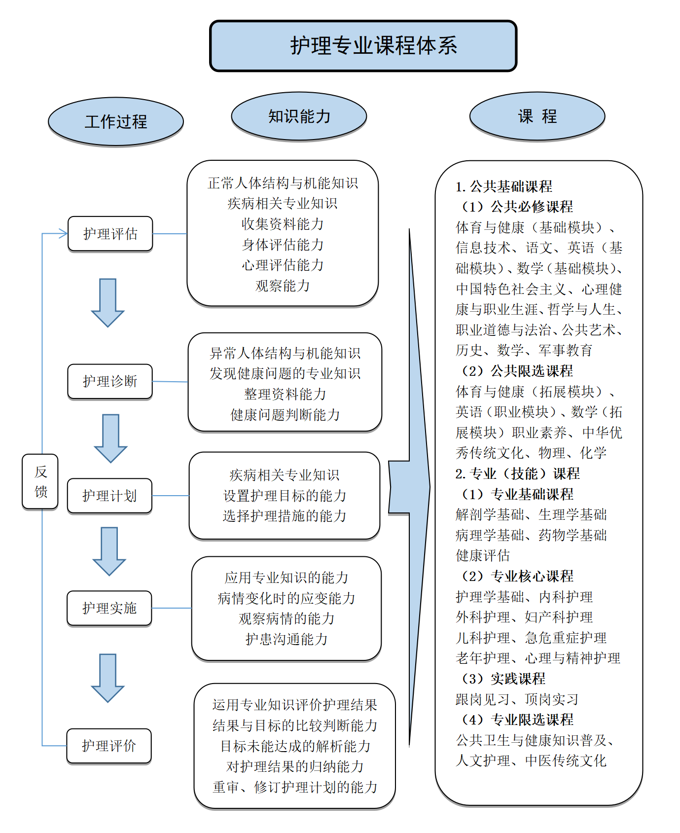 (2)专业核心课程:护理学基础、内科护理、外科护理、妇产科护理、儿科护理、急危重症护理、老年护理、心理与精神护理。