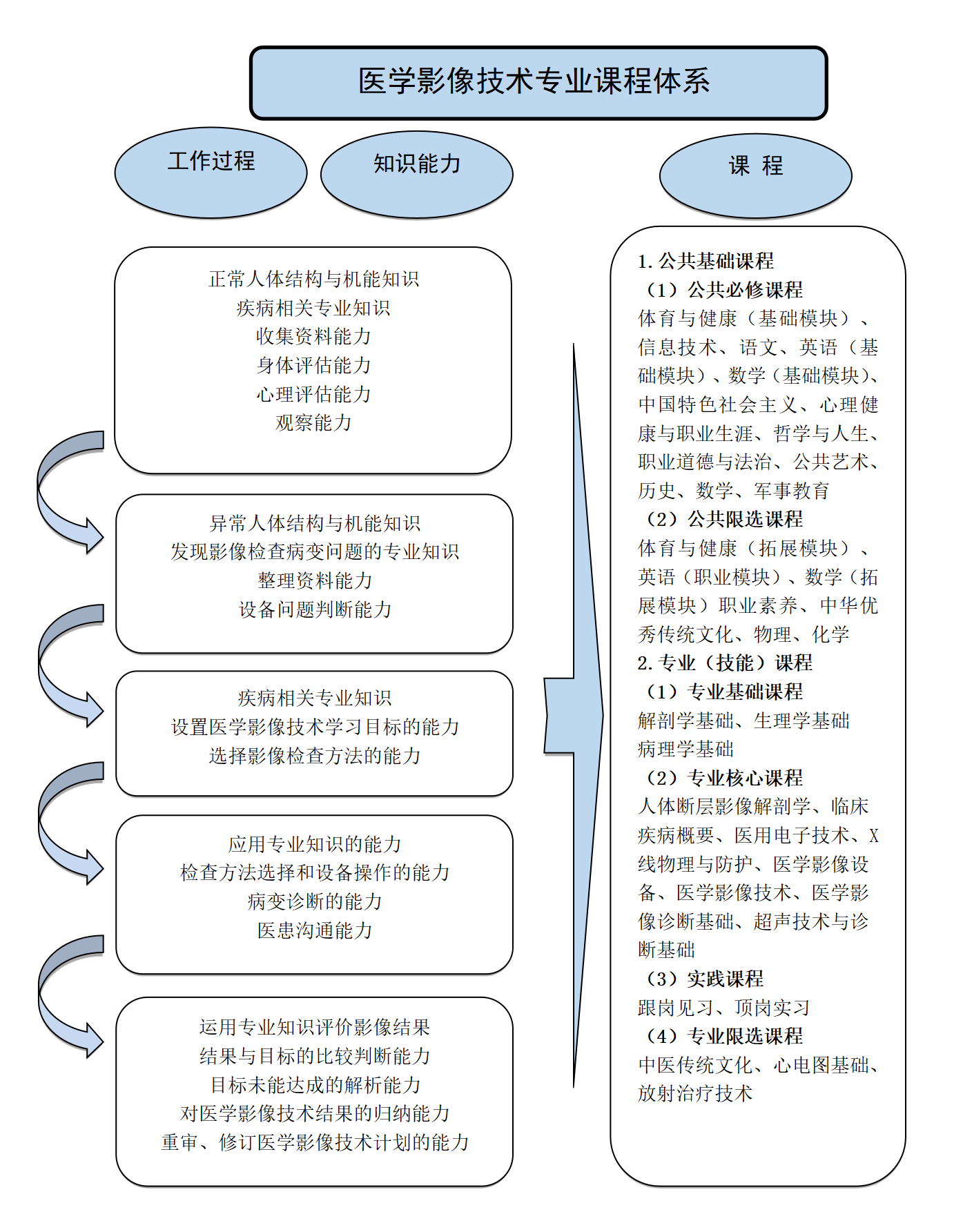 (2)专业核心课程:人体断层影像解剖学、临床疾病概要、医用电子技术、X线物理防护、医学影像设备、医学影像技术、医学影像诊断基础、超声技术与诊断基础。