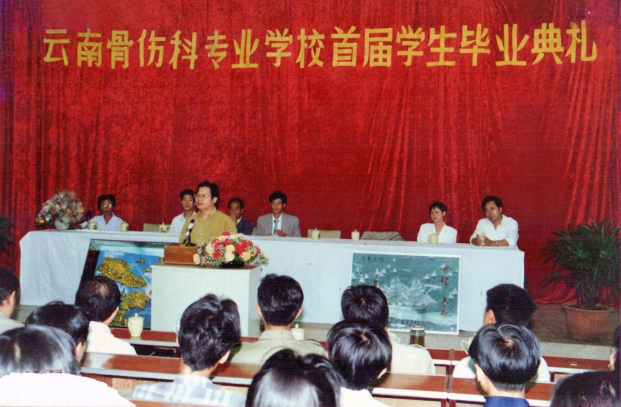 一语惊醒梦中人——作为医生,治病救人于个人有利;开办学校,教书育人则于社会有功。于是,在省教委的关心指导下,龙正昌于1993年下半年以医院为申报主体,租用原昆明市儿童福利院的废旧房屋,创办了云南骨伤科专业学校,开展写实性的非学历培训。1994年,学校开始招生,迎来首批323名学生。从此,龙正昌与医学职业教育结下了不解之缘,开启了艰苦卓绝的办学之路。