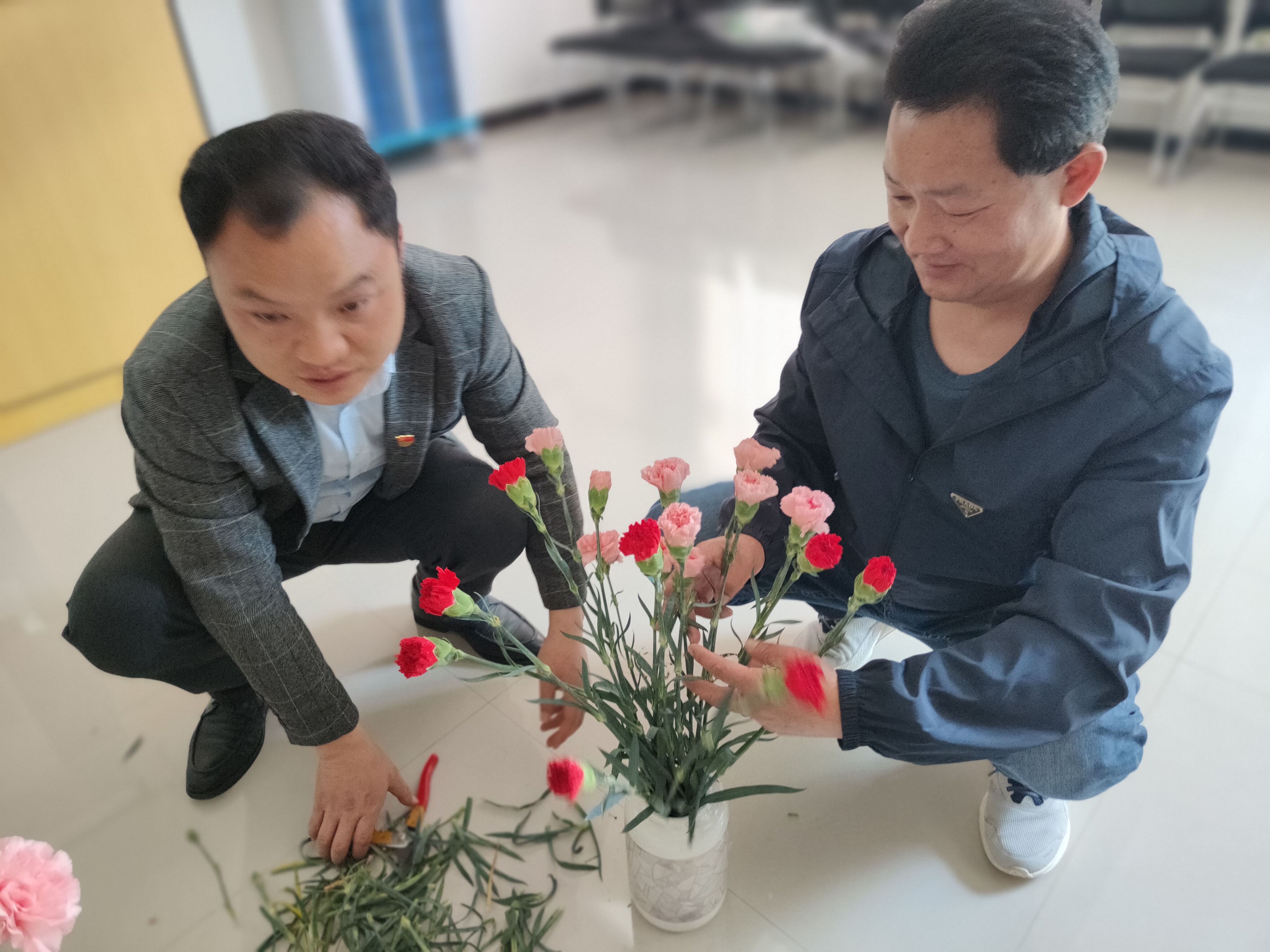 接下来开展了包花活动,老师们纷纷跃跃欲试,发挥创造力,整合造型,使得原本普普通通的花草经过她们的巧手修剪后,错落有致地悄然绽放。大家看着自己创作的花束作品,也感到了满满的成就感与幸福感。包花,作为一门古老而优雅的艺术形式,有着广泛的用途。通过包花,可以表达情感、装饰环境、疏导心情。花朵是大自然的馈赠,不同的花朵有着不同的花语和象征意义。本次活动采用了粉色跟深红色的康乃馨,代表着深深的爱和关怀,以及尊敬之情。