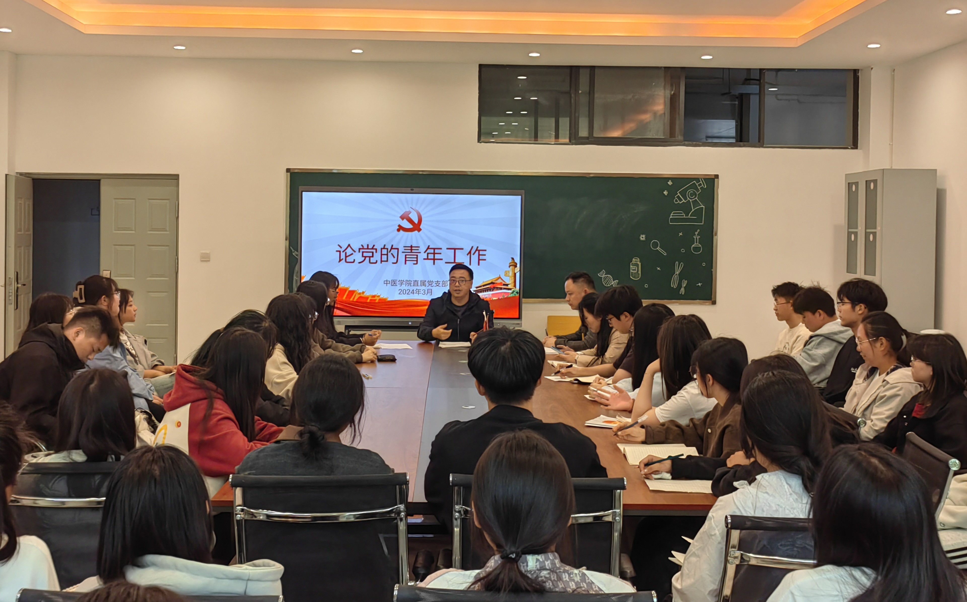 中医学院直属党支部书记易斯坐同志以“论党的青年工作”为题,主要围绕党的青年工作的历史、现状和未来发展方向进行了深入的探讨和交流。