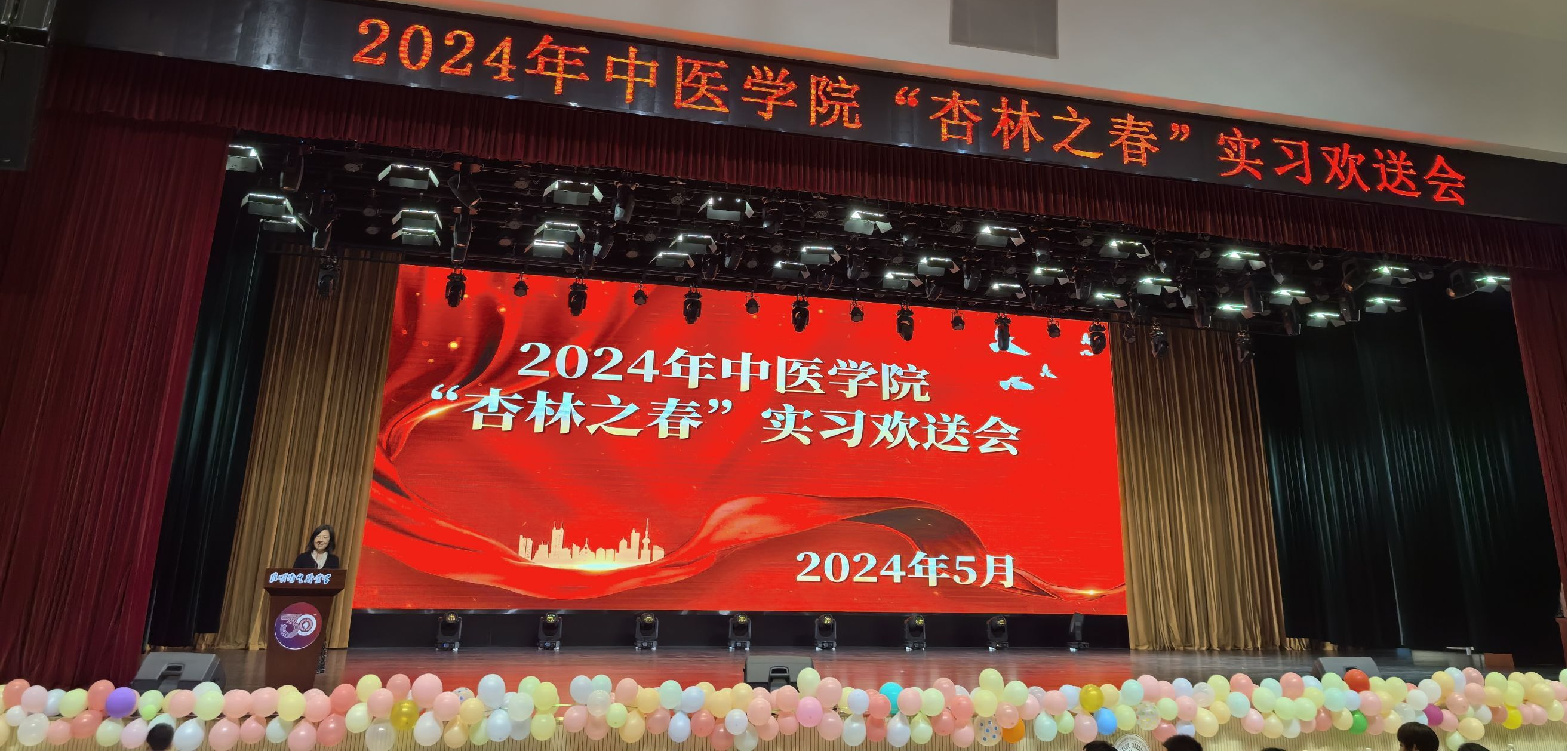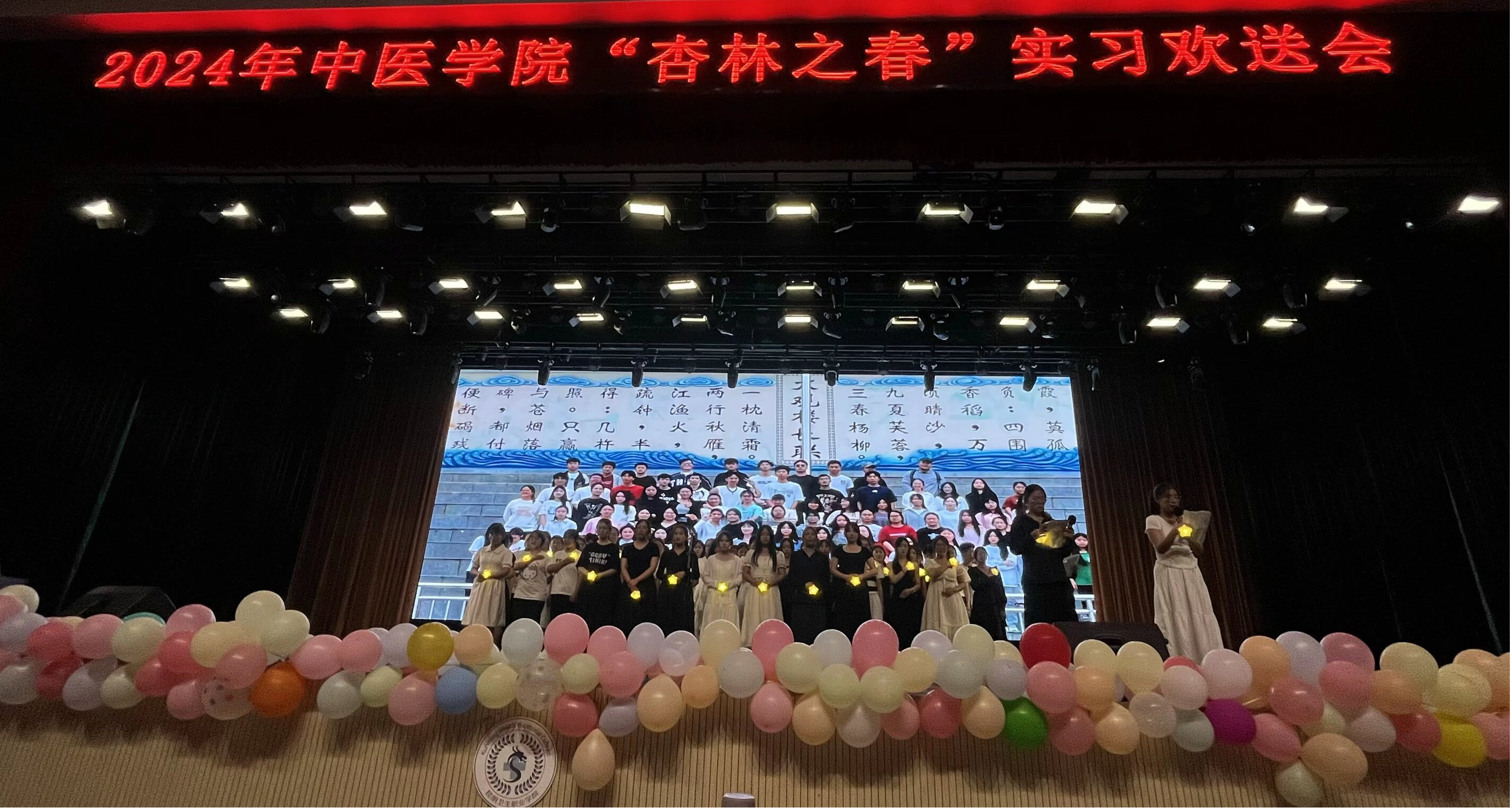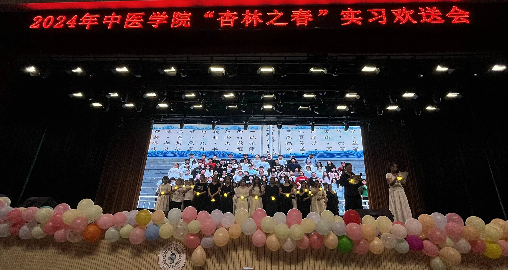 六月微风正好,花海飘香,春光尚未逝尽,离别近在咫尺,但即便岁月流逝,时光也带不走执着的梦,即便终将分别,距离也切不断真挚的师生情。为了欢送中医学院2022级实习生踏上临床实习的征程,展现他们勤奋好学、积极向上的精神风貌,同时增强实习生之间的凝聚力,中医学院于2024年5月29日晚在明德会堂举办了“杏林之春”欢送晚会。出席本次活动的领导有beat365平台官方网站党委副书记、院长龙雨霏同志,党委组织部部长、人事处处长张路同志,教务处处长孟州令老师,大学生工作部部长郭佶颖老师,各二级学院教学、学管副院长及中医学院全体师生,共计1700余人参加晚会。