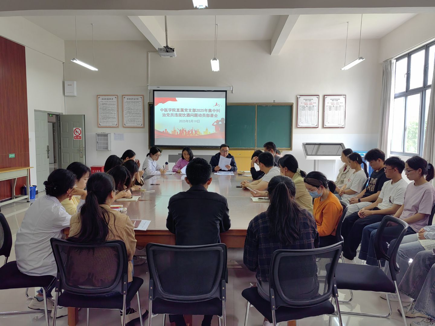 2025年5月19日,中医学院直属党支部在204室召开了2025年集中纠治党员违规饮酒问题动员部署会议,旨在进一步加强党员队伍作风建设,严肃纪律规矩,坚决遏制违规饮酒行为,营造风清气正的校园环境。