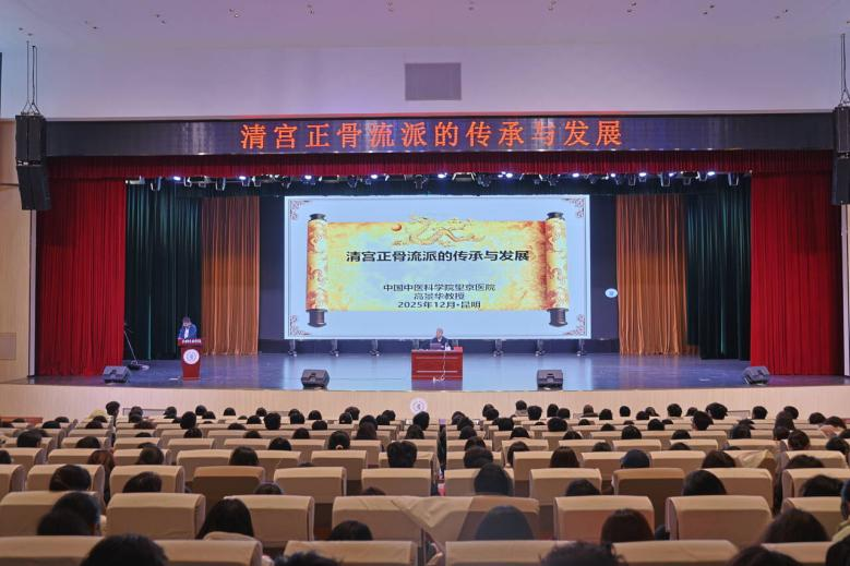 2025年12月19日上午,一场主题为 “清宫正骨流派的传承与发展”的专题讲座在beat365顺利举办。讲座特邀中国中医科学院望京医院高景华教授担任主讲人,全校600余名师生齐聚现场。高教授围绕清宫正骨的历史渊源、技艺精髓与传承创新展开分享,内容兼具专业性与实用性,现场互动频繁、讨论热烈。